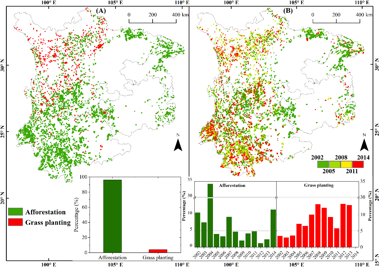 2)评估了生态恢复工程时空动态格局及其对区域生态系统GPP的影响。本研究通过土地利用变化轨迹分析方法(Trajectory analysis),基于年尺度的土地覆被数据,有效提取了西南地区2001–2015年间生态工程驱动的主要土地利用活动。研究表明,造林和植草是西南地区主要的生态恢复措施,近96%的活动与二者相关;此外,与MODIS GPP相比,基于生态过程模型的BESS GPP 与西南地区站点GPP具有更好的一致性,能够较好地反映西南地区的GPP变化趋势;造林和植草面积不到西南地区总面积的1%,但该区域对全区域年GPP增加的贡献超过了1%。其中,造林贡献最为明显,其对生态恢复区GPP的增加贡献约为 14.94%BESS GPP)和24.64%MODIS GPP)。20213月,论文在遥感领域国际期刊《Remote Sensing》(中科院2区,IF 4.848)在线发表,博士后丁智为第一作者。