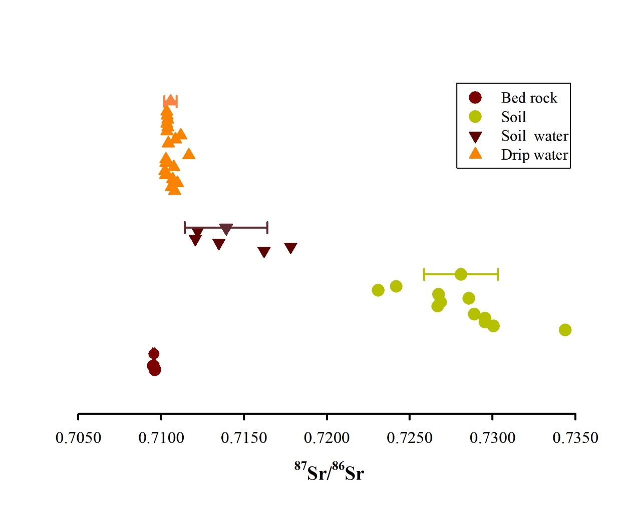 李俊云副教授和李廷勇教授团队自2005年起,在重庆芙蓉洞建立了洞穴监测系统,已经发表了多篇研究论文。在本研究中,利用2009-2018年期间对地表土壤、土壤水、基岩、洞穴滴水、洞穴新生碳酸盐沉积物等的监测,详细进行了Mg、Sr、Mg/Sr比值以及87Sr/86Sr比值的分析,并与监测期间的区域月降水量和年降水量进行了对比。