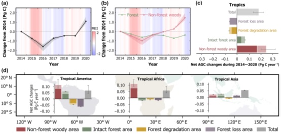 2015/16年厄尔尼诺事件期间的极端高温与干旱显著降低了热带地区地上植被碳储量(AGC)。自2016年以来,随着气候条件改善,为植被生长提供了更为有利的环境条件,同时也预示着热带地区AGC有望从厄尔尼诺事件造成的严重损失中逐步恢复。然而,关于这一恢复过程的比率及其在空间维度上的分布特征,目前仍尚不明确。针对这一问题,樊磊教授团队基于低频被动微波植被光学厚度(L-VOD)产品对2014-2020年热带地区AGC进行了估算发现,截至2020年,热带地区AGC已全面恢复至厄尔尼诺事件前的基线水平(图1a),具体表现为较厄尔尼诺事件前(2014年)AGC增加了0.18 Pg C/yr。值得注意的是,这一恢复过程主要由非森林木本植被所驱动(图1b);相比之下,热带森林AGC截至2020年仍较2014年低0.06 Pg C/yr。进一步的研究表明,热带森林AGC的下降主要集中于森林损失(0.06 Pg C/yr)与森林退化(0.07 Pg C/yr)严重的区域,这一现象直接抵消了未受扰动的原始森林所展现的AGC净增长(0.07 Pg C/yr)(图1c, d)。研究还发现厄尔尼诺事件后AGC的恢复比率与森林损失及森林退化面积占比之间存在极为显著的负相关关系,这凸显了减少森林破坏与退化在推动热带地区AGC恢复过程中的核心地位。