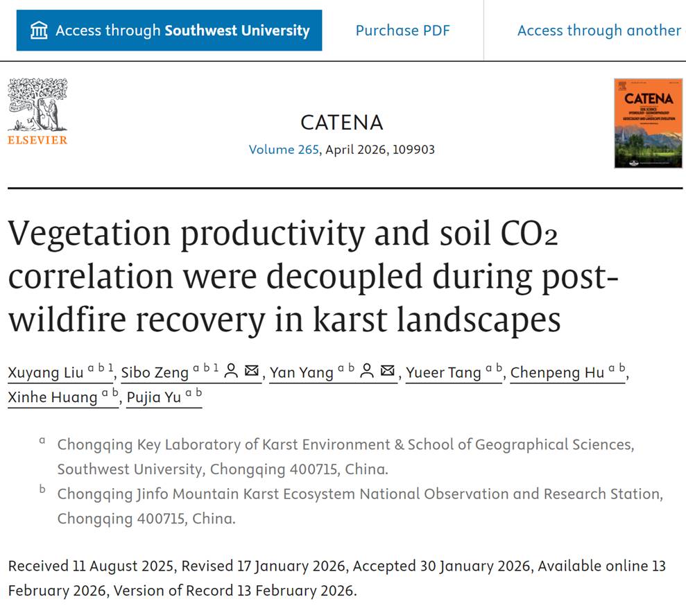 2026年2月,杨琰教授团队在地学领域Top期刊《CATENA》在线发表了题为“Vegetation productivity and soil CO₂ correlation were decoupled during post-wildfire recovery in karst landscapes”的研究论文。