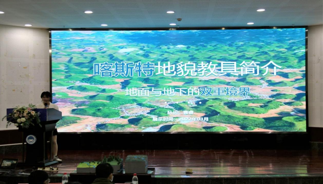 九组选手按照现场抽签顺序依次上台展演,每组选手都需经过地理模具展示、选手答辩以及评委打分三个环节。本次比赛中,各小组展示的模具种类多样、形态各异:有闻名中外的坎儿井、都江堰等水利工程模具;有中学地理中的二分二至、热力环流等概念诠释模型;有千姿百态的喀斯特地貌模型;还有具有创新意义的三维虚拟教具等等。在仅8分钟的地理模具展示环节中,各组选手们激情发挥,带领在场的同学和老师一起领略地理模具的魅力。