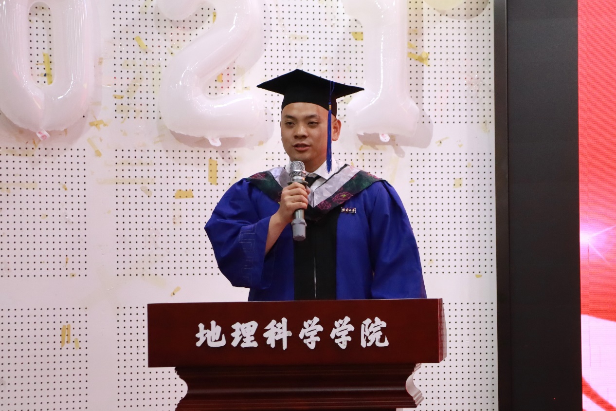 教师代表王亚辉教授以自身从农村学子“逆袭”成教授的经历激励毕业生。结合当下时代新背景,王老师提出“坚忍毅力、终身学习、乐观心态、为人大气、感恩之心”五个关键词。他寄语同学们秉持敏锐与执着,用地理智慧丈量世界,在人生新域积极探索,顺势而上绽放个人光芒。
