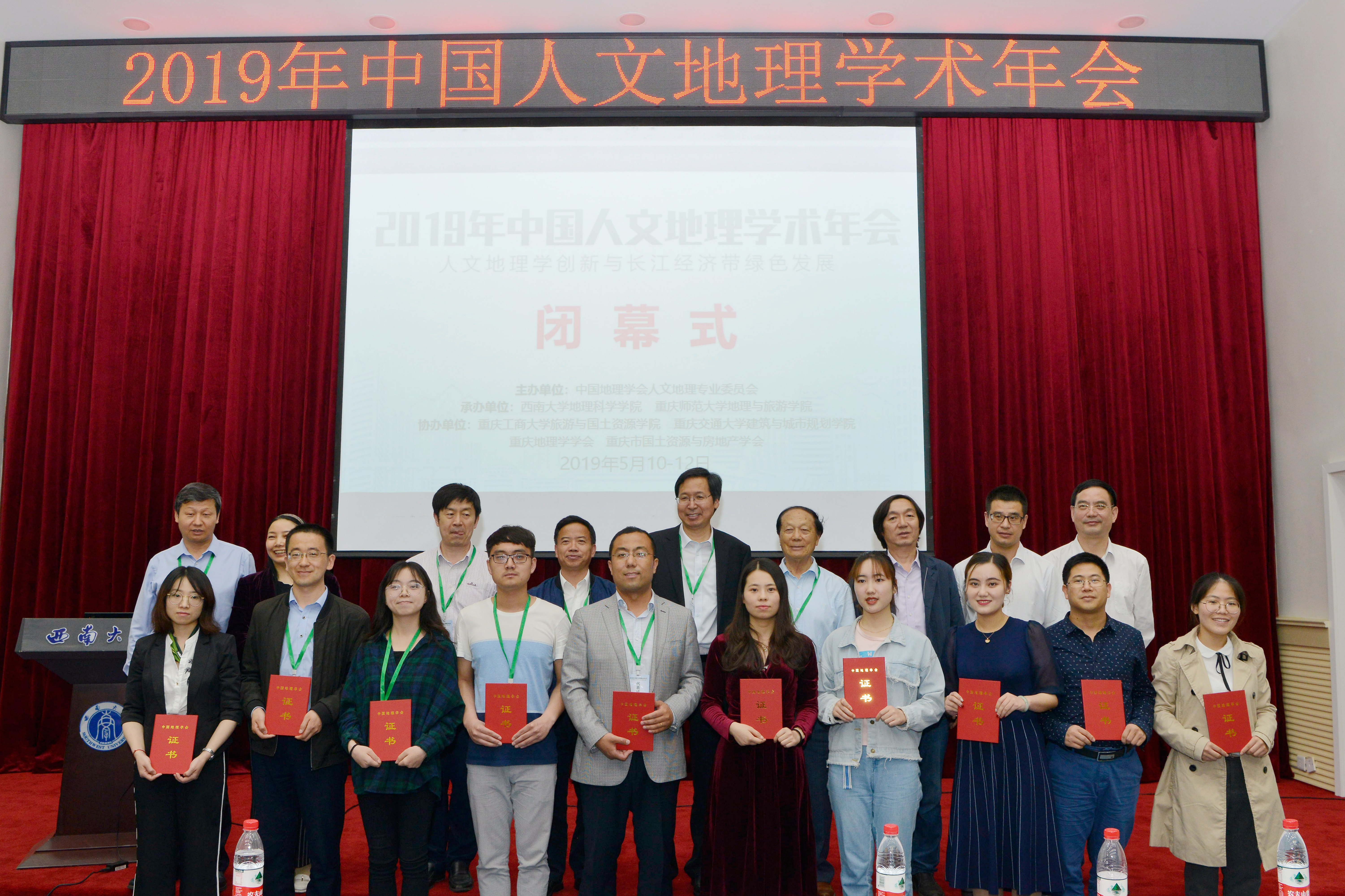 5月12日下午,大会闭幕式在太阳集团tcy8722桂园宾馆金桂厅举行。闭幕式由中国地理学会人文地理专业委员会副主任宋金平教授主持。中国地理学会人文地理专业委员会主任方创琳研究员作了大会总结发言。他对承办单位和志愿者细致而周到的服务表示感谢,表示此次大会主题鲜明、专题突出、学科融合,是一次成功高效且富有特色的会议。他强调,人文地理学者需要共同努力,进一步挖掘人文地理学的理论,创新人文地理学的方法和方法论,更好地为国家重大战略需求服务。闭幕式上还颁发了本次大会青年优秀论文奖,中山大学地理科学与规划公司博士研究生吴蓉、太阳集团tcy8722博士研究生苏康传等10位青年学者获此殊荣。浙江大学地球科学公司副经理程晓敢教授在闭幕式上接过中国人文地理学术年会会旗,并向与会代表发出2020年10月在浙江大学举办2020年中国人文地理学术年会的邀请。