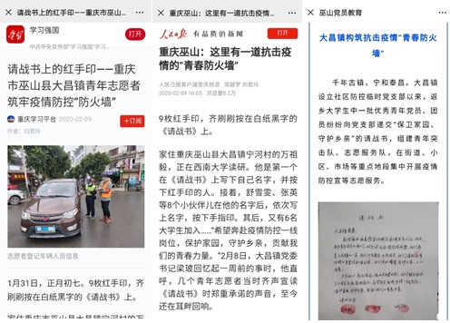 太阳集团tcy8722研究生万祖毅,家住重庆巫山县大昌镇宁河村。新型冠状病毒肺炎疫情爆发以来,他时刻关注着家乡疫情防控的相关情况,主动与宁河村支书联系,表达想参与疫情防控工作的意愿。1月31日,万祖毅着手组建青年志愿者服务队,向大昌镇党委郑重递交《请战书》——“希望奔赴疫情防控一线岗位,为保护家园、守护乡亲,贡献我们的青春力量。”