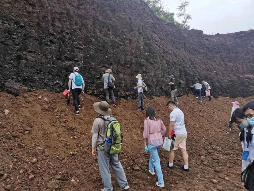 实习第二天,师生前往蓬莱史家沟,于野外观察多期玄武岩、古玄武岩风化壳等,随后前往迎山口,近距离观察学习火山锥,了解火山喷发的形式、玄武岩的用途、火山弹的特点等。