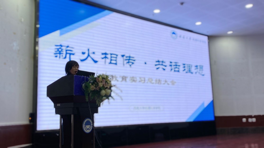 紧接着,优秀实习指导教师苏迎春老师发言。苏老师由当前就业竞争压力较大引入,分享了实习面试时对于不同情况的应对措施。同时,苏老师用以往的员工作为典范,勉励师范生们做好西大地科人的传承,为母校发展尽一份自己的光和热。