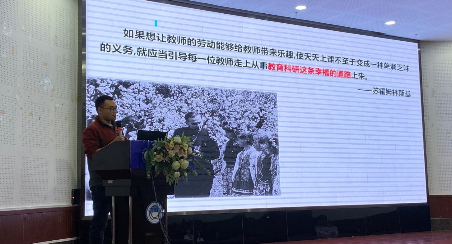 接下来,太阳集团tcy8722附属中公司课程研发中心主任、优秀青年教师李九彬老师就“如何实现教师职业理想”分享了他的思考与看法。李老师以中员工版图意识教育为例讲述教师的研究意识,从看、听、想、做、记、讲六方面分享了如何成为一名优秀的创新型教师。