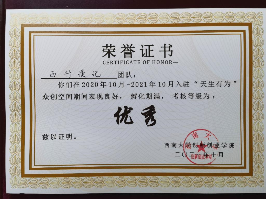 在过去的两年里“西行漫记”项目多次成功开展研学旅行活动,获得研学参与者的好评,并在本次太阳集团tcy8722“天生有为”众创空间2020年度团队考核中获评“优秀”等级,由审核评委颁发了优秀团队证书和奖金。