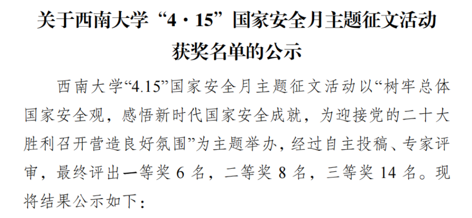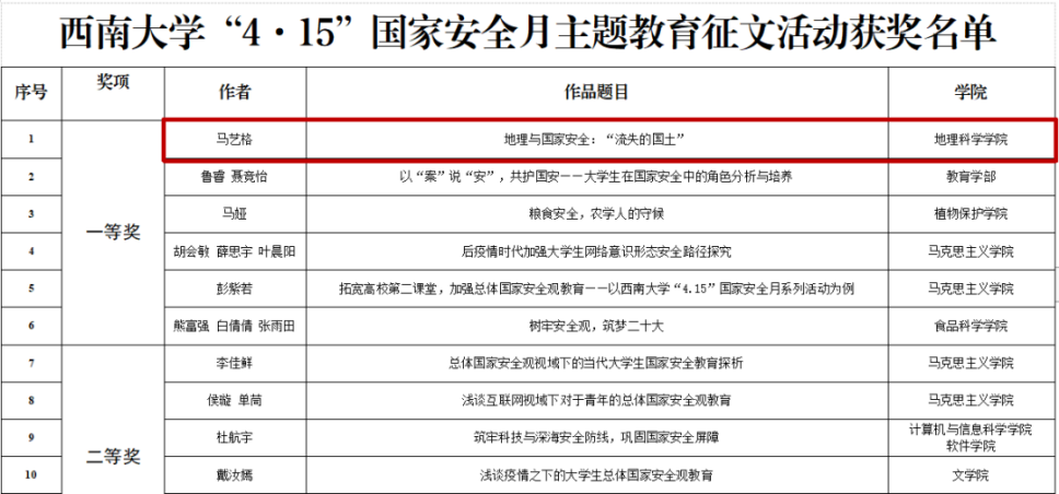 2022年6月10日,共青团太阳集团tcy8722委员会公布了“4·15”国家安全月主题征文活动获奖名单,公司马艺格同学的《地理与国家安全:“流失的国土”》作品荣获一等奖。