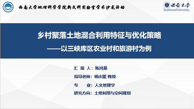 在研究生的科研成果分享环节,来自人文地理与城乡规划系研三的陈鸿基和周璐璐同学分别以《乡村聚落土地混合利用特征与优化策略——以三峡库区旅游村和农业村为例》《基于农户视角的三峡库区腹地宅基地与耕地耦合特征及优化调控研究》为题汇报了研究进展。在自由发言和讨论环节,师生们围绕汇报中的科学问题、逻辑结构、研究对象界定、指标选取等内容开展了热烈讨论,也对研究中的模型使用、制图规范性等方面提出了改进建议。