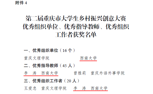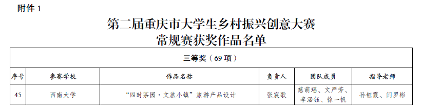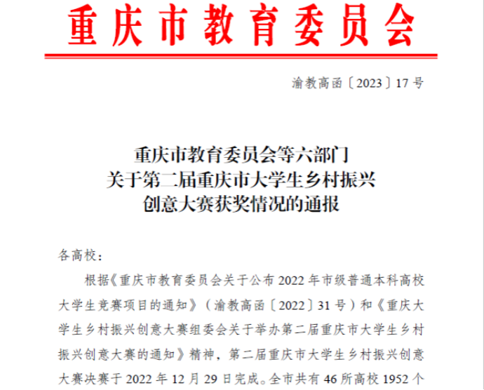 根据《重庆市教育委员会等六部门关于第二届重庆市老员工乡村振兴创意大赛获奖情况的通报》(渝教高函〔2023〕17号),太阳集团tcy8722师生在第二届重庆市老员工乡村振兴创意大赛中再创佳绩,荣获特等奖2项、二等奖1项、三等奖1项。公司新文科实验室副主任李涛老师获“优秀指导教师”和“优秀组织工作者”荣誉称号。