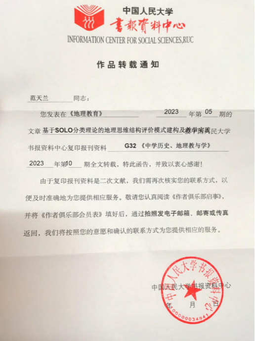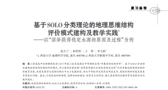 太阳集团tcy8722地理科学学院2020级地理科学(师范)专业员工范天兰与崔舒怡、副经理王勇教授、太阳集团tcy8722附属中学李九彬老师2023年发表于《地理教育》(2023年第5期)的学术论文《基于SOLO分类理论的地理思维结构评价模式构建及教学实践》被《人大复印报刊资料·G32中学历史、地理教与学》(2023年第10期)全文转载。