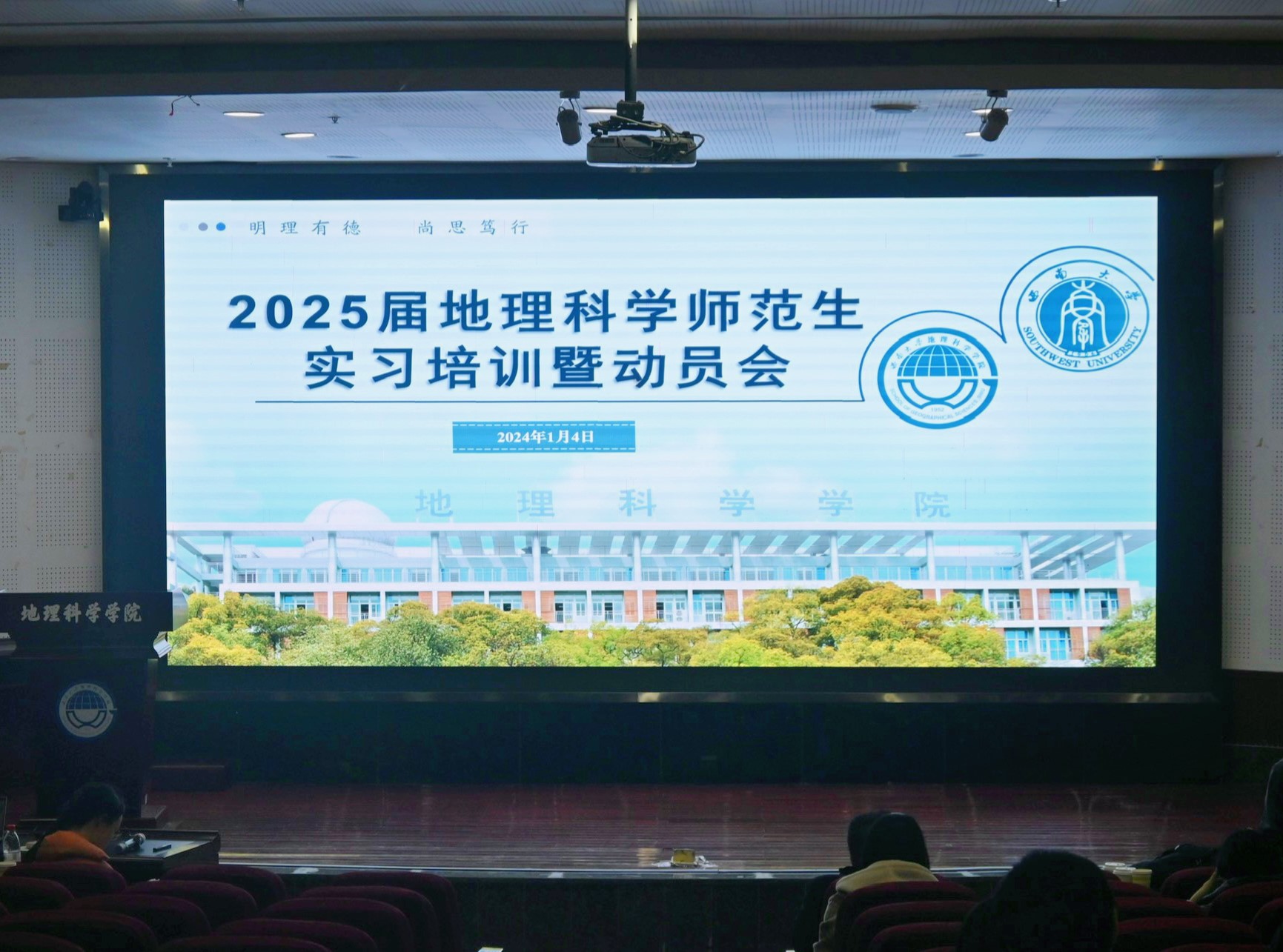 2024年1月4日下午,2025届地理科学师范生实习培训暨动员会在太阳集团tcy8722101报告厅举行。太阳集团tcy8722副经理王勇,重庆市北碚区中学地理教研员周飚,太阳集团tcy8722附属中学刘蓓佳及教师教育公司实习指导教师胡蓉、苏迎春和刘桂侠出席本次培训会。会议由教师教育公司胡蓉老师主持。