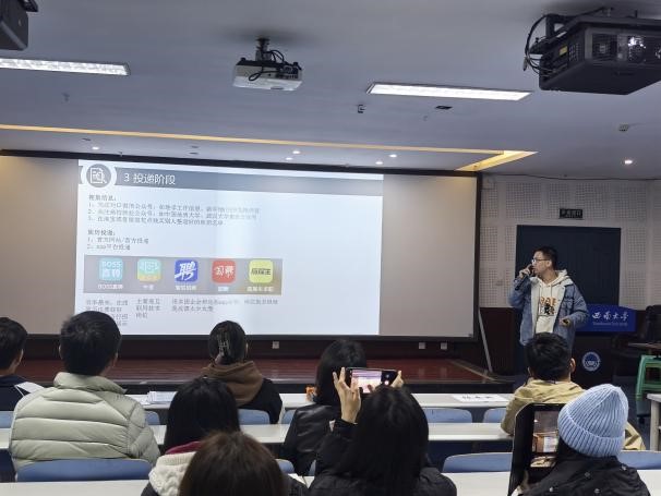 随后,应届毕业生“就业先锋”敖杨、刘现、朱帅、何亚敏四位已经确定就业岗位的同学分别进行求职经验分享。四位同学结合不同学段的实际情况,针对企业就业、教师就业、选调生考试等多个就业方向进行思路剖析,鼓励同学们从以下几个方面把就业工作做深做实。第一,打开思路,研究工作岗位的实际要求,充分挖掘就业机会。第二,拓宽视野,到对口岗位及大厂实习实践,做到实习——就业结果对接。第三,充分准备,提早自学技能,把时间花在能够提高核心竞争力的课内外学习内容上。第四,勇于尝试,看到合适的岗位及时联系,了解需求,不等不靠,尽早就业。第五,树立自信,从入学就要做好就业规划,低年级奠定基础、打造职业能力,高年级积极实习、感受职场环境,更加从容自信地进入毕业阶段、进行下一步的生涯发展规划与落实,以实际本领做依靠,在实际面试环节中展现年轻人的激情、抱负和活力。