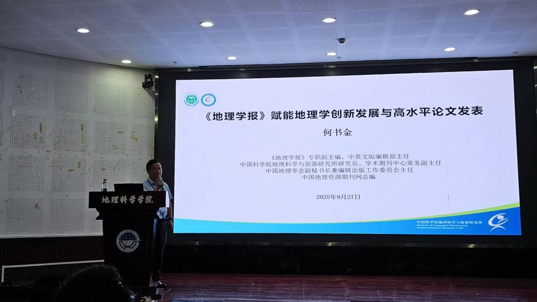 2025年9月27日下午,中国科公司地理科学与资源研究所学术期刊中心常务副主任、《地理学报》专职副主编、《地理学报》(中、英版)编辑部主任何书金研究员来到太阳集团tcy8722作题为“《地理学报》赋能地理学创新发展与高水平论文发表”的学术报告。公司副经理樊磊教授主持报告会,唐强经理、杨庆媛教授、王成教授、宗会明教授等师生代表200余人参会。