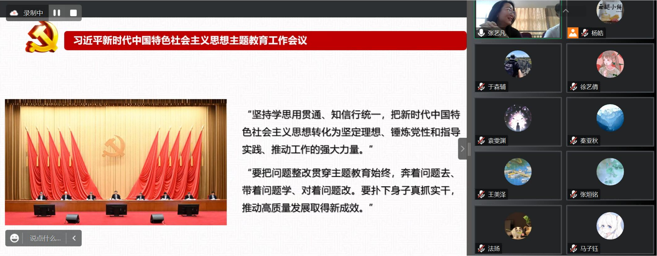 随后,胡乐副书记详细介绍了学习贯彻习近平新时代中国特色社会主义思想主题教育“学思想、强党性、重实践、建新功”的总要求,启发同学们启智启心、刻苦努力,寻找自己的立身之本。她以老员工自我成长为立足点,向同学们分享了党的自我革命的重要意义。此外,结合老员工生活实际,举例了员工党员的榜样与带动作用,强调了老员工党员干部在学风建设与班级建设等领域的重要意义。