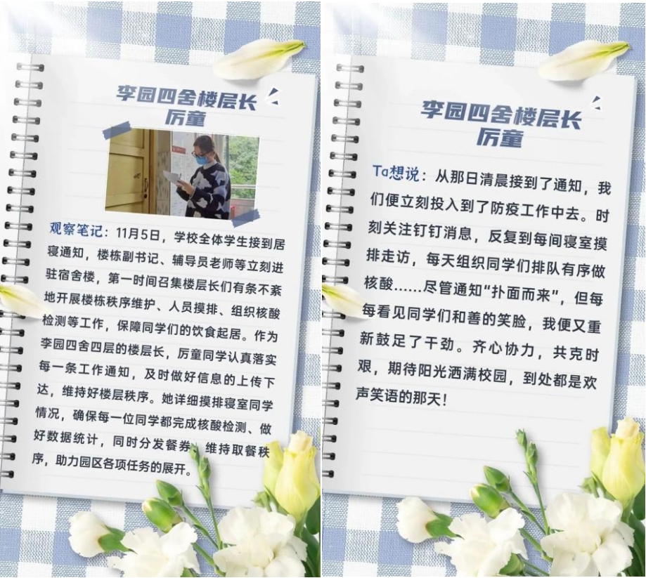 疫情防控重于泰山,平静的生活下是无数志愿者奔波的身影。在我们身边,总有那么一群人,他们毅然决然地奉献自己,为同学们尽心尽力,勇于担当,做疫情中的“逆行者”,冲锋在为人民服务的前线。