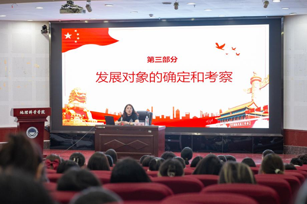 胡孜老师向各位新生介绍了发展党员的各项流程,从申请入党、入党积极分子的确定与培养教育、发展对象的确定与考察、预备党员的接收、预备党员的教育考察和转正五个部分进行了详细介绍。