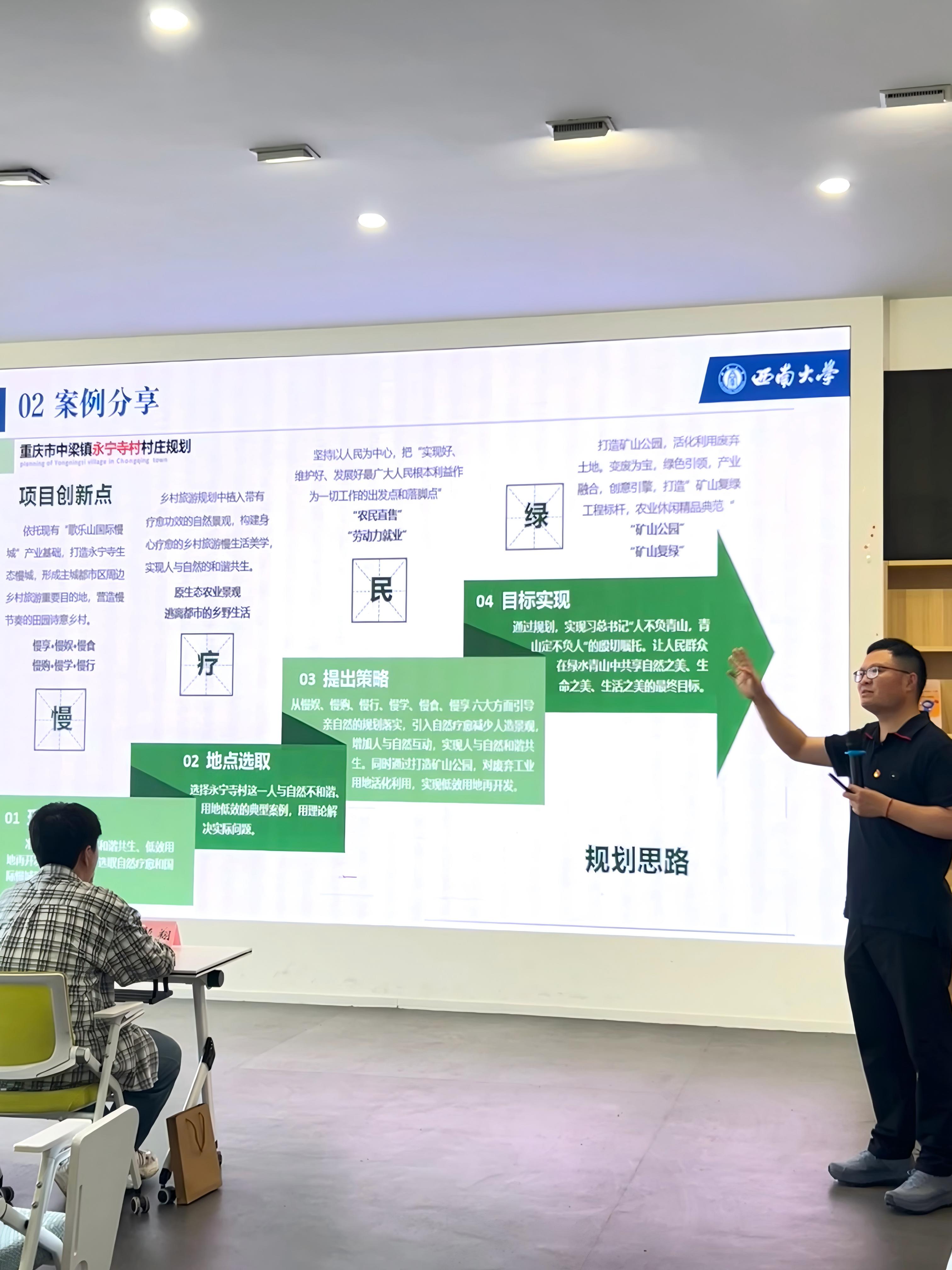 刘毅翔同学结合全国老员工国土空间规划技能大赛参赛经历,分享国土空间规划类作品的选题构思、方案设计与实践落地经验。他以重庆青龙庙村规划项目为例,生动展现了地理专业知识服务乡村振兴的实践路径,为同学们参与规划类竞赛提供了可借鉴的完整流程。