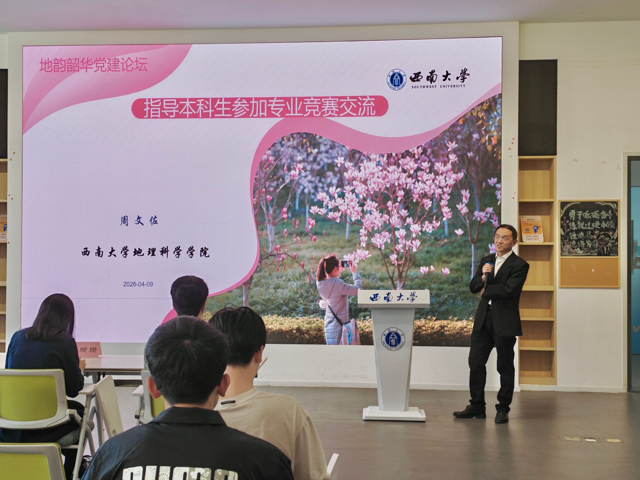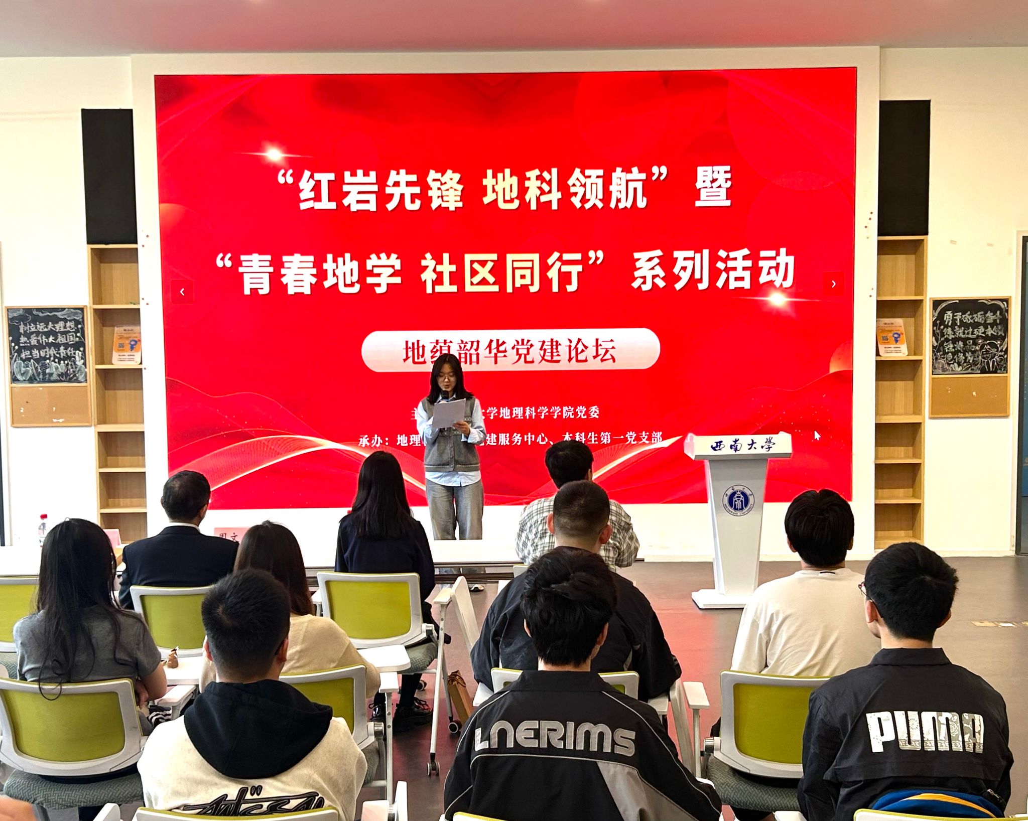 为推进党建引领与学科发展深度融合,推动以赛促学、以学促行,2026年4月9日,太阳集团tcy8722于青李空间A11多功能厅顺利开展“红岩先锋·地科领航”暨“青春地学 社区同行”系列活动——地蕴韶华党建论坛。本次论坛聚焦高水平学科竞赛交流,邀请优秀学子与专业教师同台分享,为全院本科学子带来一场内容充实、指导性强的成长交流活动。