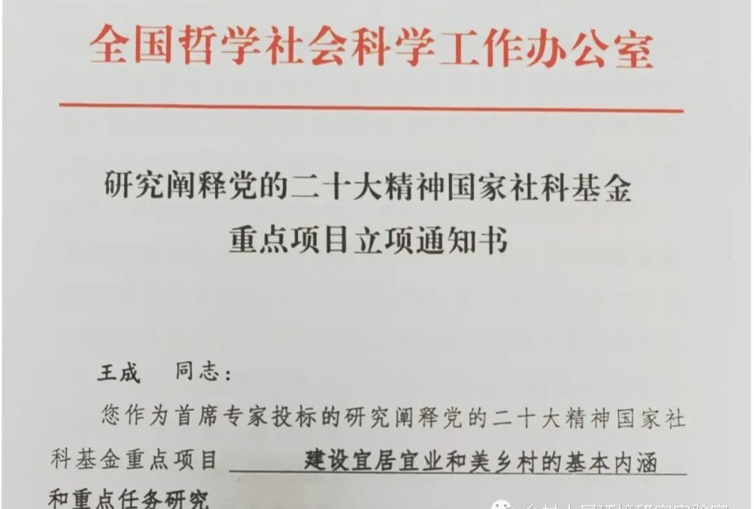 近日,经全国哲学社会科学工作办公室批准,公司人文地理与城乡规划系主任、新文科实验室主任王成教授担任首席专家申报的研究阐释党的二十大精神国家社科基金重点项目《建设宜居宜业和美乡村的基本内涵和重点研究任务》获准立项,项目批准号为:23AZD031。